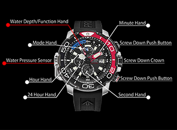 The watch simultaneously displays the current time as well as the current dive depth. It can also display the maximum dive depth after the dive has finished (the depth gauge can measure up to 50 meters). The water sensor detects when the watch enters the water, automatically switching to dive mode, indicated by the water depth hand pointing to DV. The depth meter automatically engages when the watch is underwater, and the water depth hand automatically shows the current depth. The dial ring indicates depths commonly used by divers (3, 6, 9, 12, and 15 meters) in 3 meter increments down to 15 meters. The water depth hand gradually returns to its original position as the diver resurfaces. When the watch is taken out of the water, it automatically switches from dive mode to regular mode.