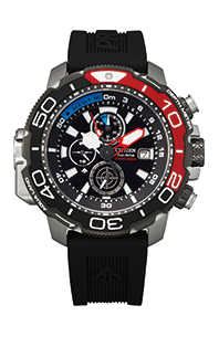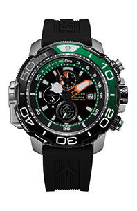 The 50.4 mm case has an innovative three-piece construction with a unique profile that gives the watch its rugged look. The matte black of the dial contrasts with the different shapes of the hands to ensure high visibility. The design of the subdial at the six o’clock position was inspired by a submarine sonar screen. These light-powered Eco-Drive models incorporate CITIZEN’s proprietary technologies, allowing the watch hands to display both the time and depth simultaneously. The addition of a chronograph function results in an intricate dial design that also provides the high visibility needed in a diving watch. These professional sports watches provide functionality, durability, and safety features with a stylish design that can be coordinated with any type of clothing around town.