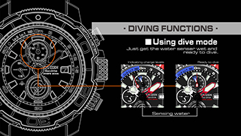 The watch simultaneously displays the current time as well as the current dive depth. It can also display the maximum dive depth after the dive has finished (the depth gauge can measure up to 50 meters). The water sensor detects when the watch enters the water, automatically switching to dive mode, indicated by the water depth hand pointing to DV. The depth meter automatically engages when the watch is underwater, and the water depth hand automatically shows the current depth. The dial ring indicates depths commonly used by divers (3, 6, 9, 12, and 15 meters) in 3 meter increments down to 15 meters. The water depth hand gradually returns to its original position as the diver resurfaces. When the watch is taken out of the water, it automatically switches from dive mode to regular mode.