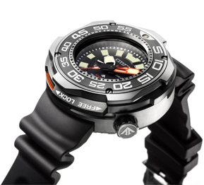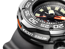 We made the bezel of the PROMASTER unidirectional in line with the ISO standard for diving watches. This improves safety by eliminating the danger of a diver accidentally turning the bezel the wrong way during a dive. The Eco-Drive Professional Diver 1000m model is equipped with a bezel-locking mechanism.