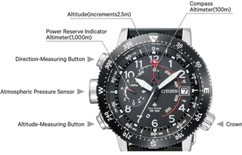 Movement | Cal:J280 / Accuracy of ±15 seconds per month / Eco-Drive / Runs 11 months on full charge / Altimeter (-300m to 10,000m) / Electronic compass / Calendar / Power reserve indicator / WR200 / Luminous(hands+ index) |