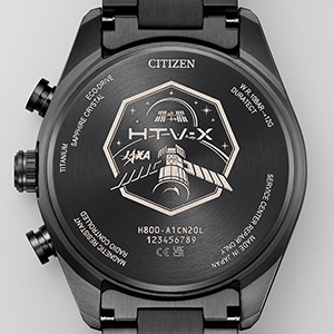 This model is a Eco-Drive*3 Radio-Controlled*4 watch equipped with Direct Flight*5 which allows easy adjustment of the time and date in 26 time zones with just a twist of the crown. It automatically receives time signals in four global regions (Japan, China, USA, Europe). A logo featuring the HTV-X is also engraved on the case back.