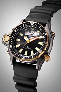 The CITIZEN PROMASTER line of professional sports watches offers superior functionality to ignite the imagination. The latest release from the PROMASTER lineup is the "Aqualand 40th Anniversary Limited Edition," which commemorates the 40th anniversary of the world's first diver's watch equipped with an electronic depth meter.